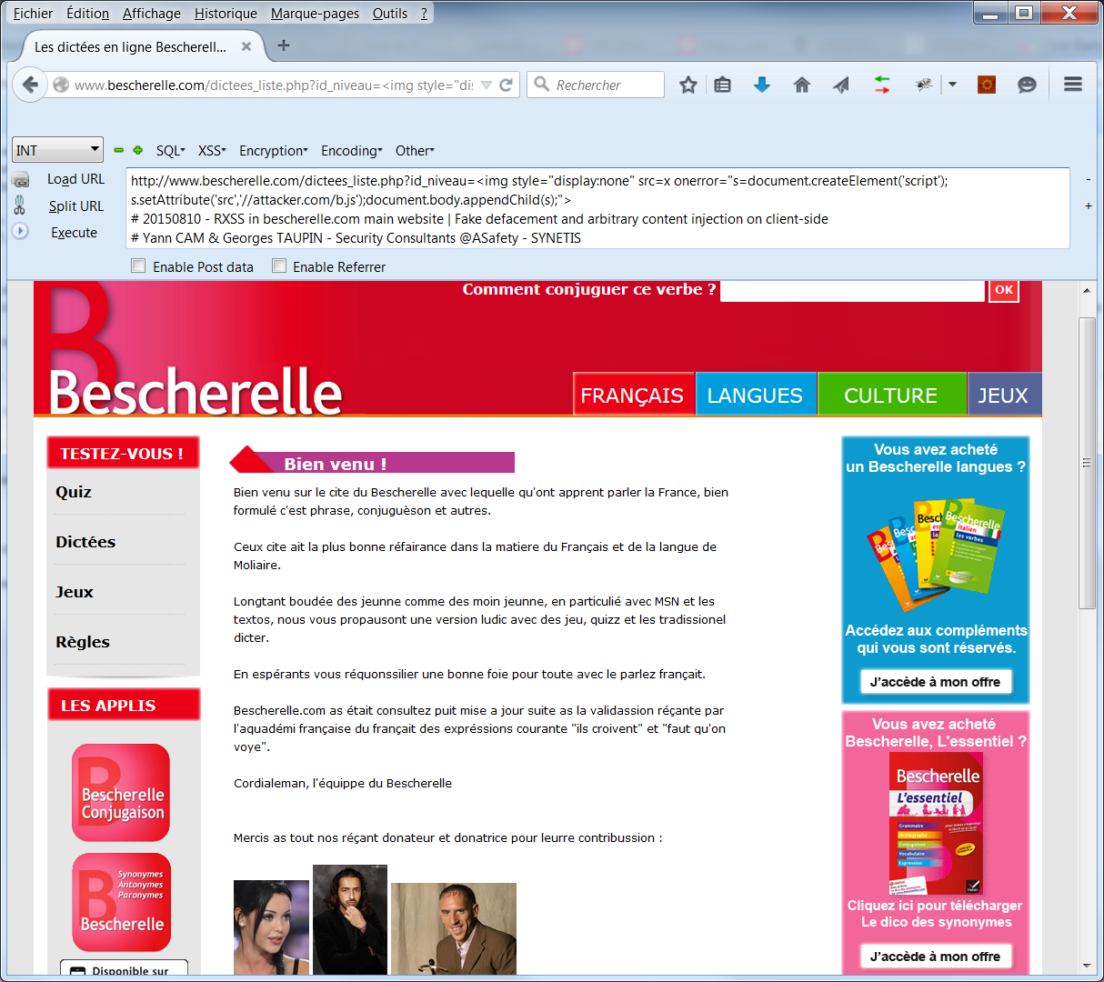 Je précise que le contenu de la page visible sur la capture précédente est pleinement fictif, en aucun cas persistant sur le site du Bescherelle et uniquement voué à illustrer la modification du DOM via la RXSS.